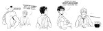 – Expressions – let them emerge from your design. If your various characters have distinguishing features, the expressions they make with those features will distinguish them further. Allow personality to influence expressions too, or vice versa. Often, a bit of both happens as you continue drawing – physiognomy and personality converge somewhere in the middle.