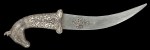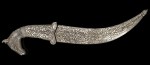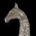 Originating from North India, very stylish in Rajasthan, the handle of the dagger is worked in the shape of a horse head, apparently a prestigious animal and source of pride for Rajput nobles. It has a steel curved blade with damask decoration. The Bidri handle and sheath feature foliage decoration.