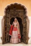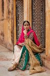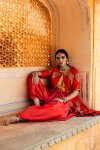Taking centrestage, gotapatti embroidery has been delicately sewn with zari, resham French knots and mirror work to create dazzling motifs and patterns.